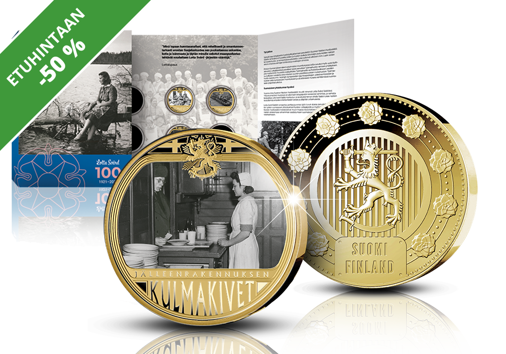 Kun tilaat Lotta-mitalin, saat toimitustakuun Jälleenrakennuksen kulmakivet -kokoelmaan. Historiallisen aikakauden vaiheita seuraava kokoelma sisältää yhteensä seitsemän aidolla 24 karaatin kultauksella viimeisteltyä mitalia. Jatkossa saat Jälleenrakennuksen kulmakivet -kokoelman mitaleita yhden kerrallaan noin kuukauden välein hintaan 32 euroa (+ toimituskulut 6,95 euroa) kappale. Kokoelman kerääminen on täysin turvallista, sillä jokaisella lähetyksellä on 14 päivän palautusoikeus ja jatkat keräämistä juuri niin kauan kuin itse haluat.