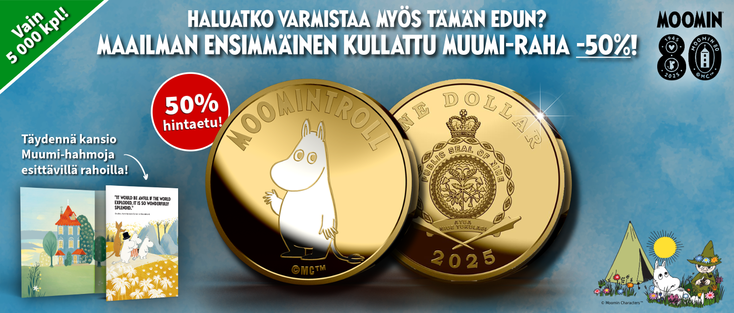 Saat Muumit 80 vuotta -juhlamitalin ILMAISEKSI, maksat vain toimituskulut 4,95 euroa. Mitali on yksittäistuote, joten et sitoudu muihin tilauksiin. Mitali on toteutettu yhteistyössä Moomin Charactersin kanssa.